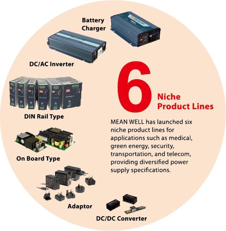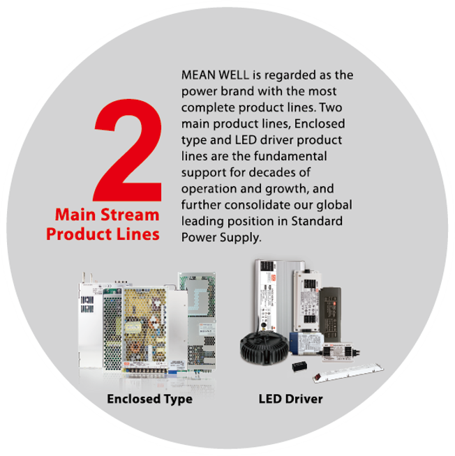 Şirketin sürekli yenilik ruhunu destekleyen MEAN WELL, her yıl ürün hatlarına %10 yeni cihaz ekliyor. AC / DC güç kaynağı, LED sürücüler, AC / DC pil şarj cihazları, DC / DC dönüştürücüler ve DC / AC dahil eviriciler olmak üzere farklı endüstrilerin uygulama gereksinimlerini karşılamak için farklı sınıflarda 0,5W~25,600W aralığında eksiksiz güç kaynağı çözümleri sunuyoruz.