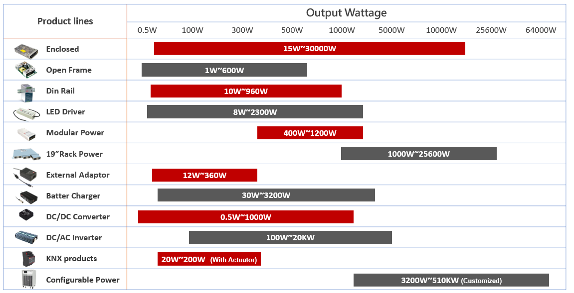 Şirketin sürekli yenilik ruhunu destekleyen MEAN WELL, her yıl ürün hatlarına %10 yeni cihaz ekliyor. AC / DC güç kaynağı, LED sürücüler, AC / DC pil şarj cihazları, DC / DC dönüştürücüler ve DC / AC dahil eviriciler olmak üzere farklı endüstrilerin uygulama gereksinimlerini karşılamak için farklı sınıflarda 0,5W~25,600W aralığında eksiksiz güç kaynağı çözümleri sunuyoruz.